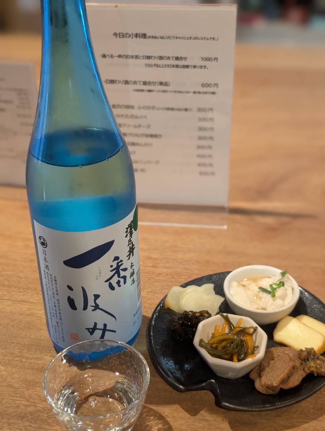 店内には立ち飲み席やいす付き席などがあり、30種類ほどの日本酒の中で気になる日本酒を350円からその場で愉しむことができます。日本酒以外にもビールやハイボール、ワイン、果実酒などもございます。お酒に合うあてもお手ごろな値段からご用意しています。